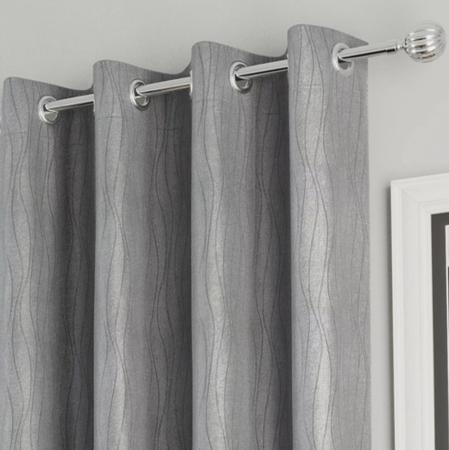 Goodwood is a triple weave room darkening embossed readymade with horizontal wave design and eyelet header.