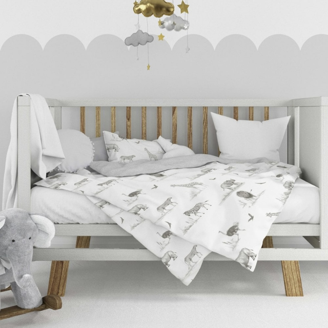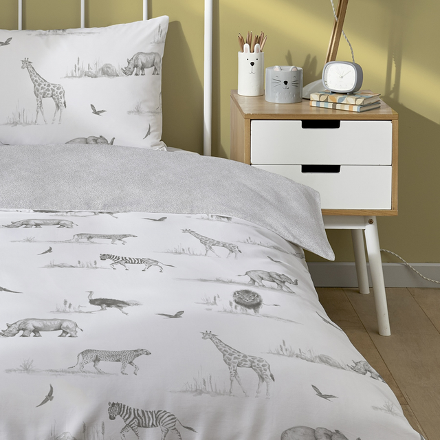 This duvet cover set is children’s love of safari animals, transporting you to a world of fun and adventure whilst retaining an air of subtle sophistication. This duvet cover set features a sketched print of all the safari animal favourites in a soft silver grey on white with a ditsy animal print reverse, crafted from a silky soft and breathable cotton-rich fabric for durability, easy laundering, and comfort.